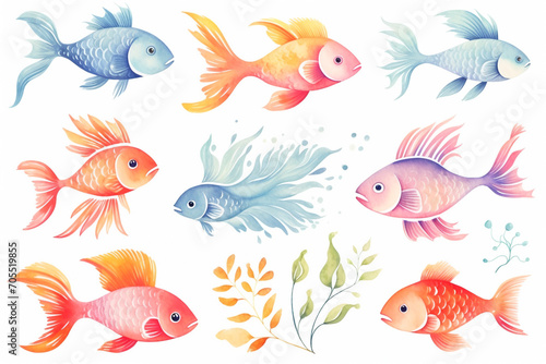 © pritsadee, Naklejka premium Set of watercolor paintings Goldfish on white background.