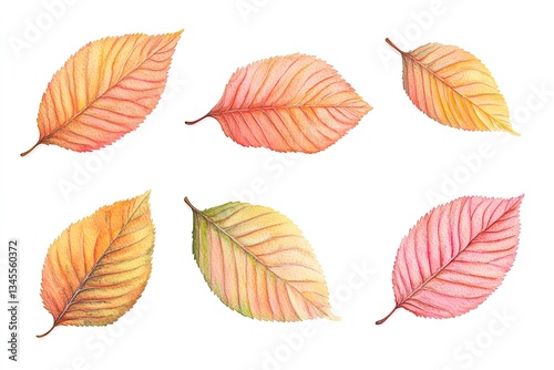 © Barra Fire, Obraz premium Set of watercolor Zelkova Leaves hand drawn on a white background