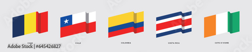 © Dope Art Studio, Obraz premium Set of waving 3D flags of Chad, Chile, Colombia, Costa Rica, Cote D'Ivoire. Vector illustration for graphic and web design.