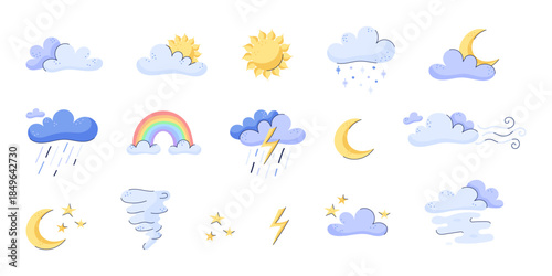 Obraz premium Set of weather elements. Hand drawn icons of the sun, clouds, rain, wind, thunderstorms, stars and moon. Weather forecast for mobile apps and websites. Doodle vector illustration. Suitable for prescho