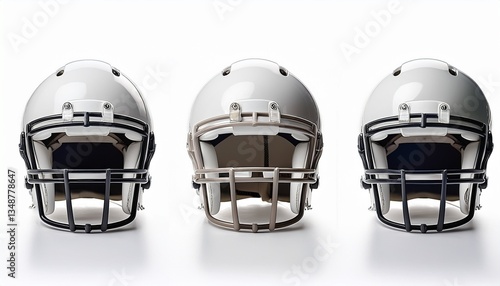 © Hanania Project, Fototapeta premium Set of white American football helmets isolated on white background. Generated image
