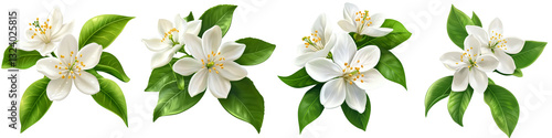 © md alamin, Obraz premium set of White lemon flowers with green leaves, white lemon flowers and green leaves, white lemon flowers surrounded by green leaves, white flowers, green leaves, on a transparent backgrounds