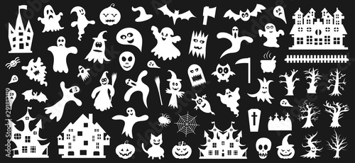 © Ms VectorPlus, Fototapeta premium Set of white silhouettes of Halloween on a black background. Vector illustration