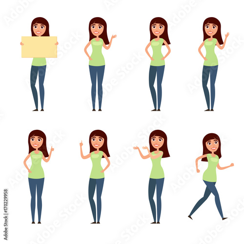Fototapeta premium Set of woman, girl in casual clothes in different poses. A character for your design project. Vector illustration in flat and cartoon style