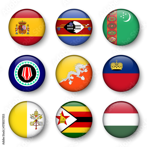 Obraz premium Set of world flags round badges ( Spain . Swaziland . Turkmenistan . Bougainville . Bhutan . Liechtenstein . Vatican city . Zimbabwe . Hungary )