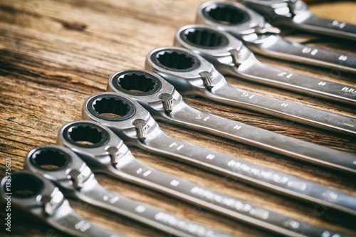 © Rawf8, Fototapeta premium Set of wrenches on wooden background