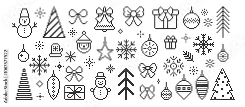 Fototapeta premium Set of xmas icons of christmas tree, present, snowman, bow, snowflake, jingle bell. Pixel art vector illustration.