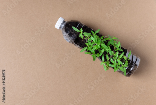 Naklejka premium Set of young tomato seedlings in recycled plastic bottles.environmental...