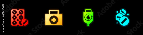 Fototapeta premium Set Pills in blister pack, First aid kit, IV bag and Medicine pill or tablet icon. Vector