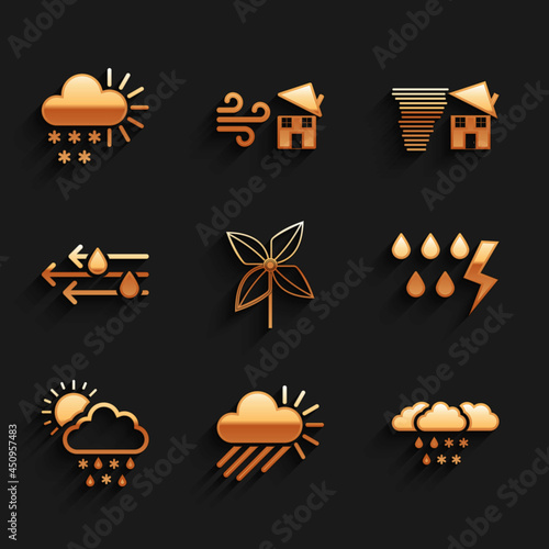 Fototapeta premium Set Pinwheel, Cloudy with rain and sun, snow, Storm, rain,, Wind, Tornado swirl and icon. Vector