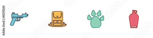 Fototapeta premium Set Pistol or gun, Hiking backpack, Paw print and Canteen water bottle icon. Vector