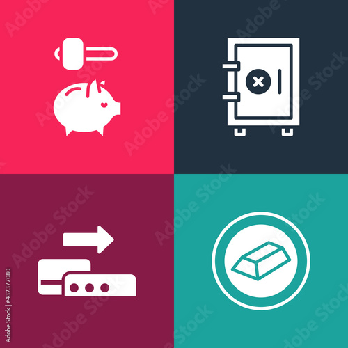 Fototapeta premium Set pop art Gold bars, Pos terminal, Safe and Piggy bank and hammer icon. Vector