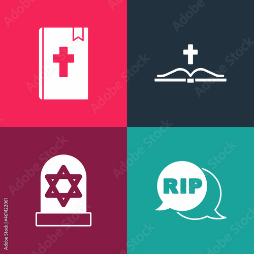 Fototapeta premium Set pop art Speech bubble rip death, Grave with star of david, Holy bible book and icon. Vector