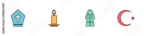 Fototapeta premium Set Pope hat, Burning candle, Hands praying position and Star crescent icon....