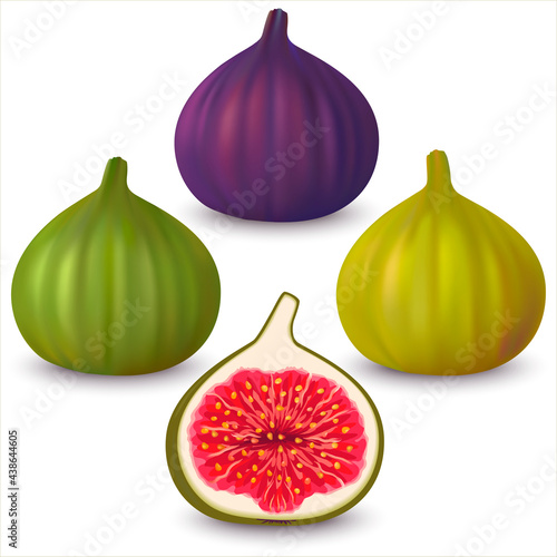 © Art_freeman, Fototapeta premium Set realistic green, yellow, violet whole and half cut figs on isolated on white background