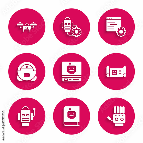 Fototapeta premium Set Robot, User manual, Mechanical robot hand, blueprint, vacuum cleaner, Computer api interface and Drone icon. Vector
