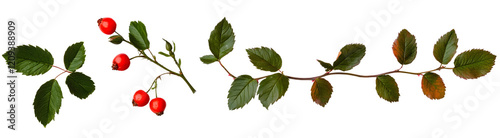 © Daniel, Fototapeta premium set rosehip branches with red berries and green leaves. twigs with berries are isolated