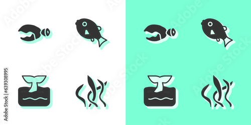 © Kostiantyn, Fototapeta premium Set Seaweed, Lobster or crab claw, Whale tail in ocean wave and Tropical fish icon. Vector