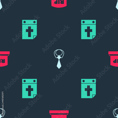 © Kostiantyn, Fototapeta premium Set Tombstone with RIP written, Tie and Calendar death on seamless pattern. Vector