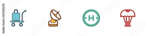 Obraz premium Set Trolley baggage, Radar, Helicopter landing pad and Box flying on parachute icon. Vector