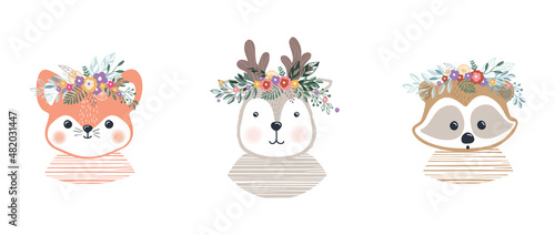 Naklejka premium Set vector illustration of cute little fox,fawn and a raccoon. Baby picture, print on clothes.Flat design.