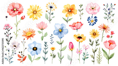 © Wildflower, Obraz premium Set watercolor flowers and butterflies