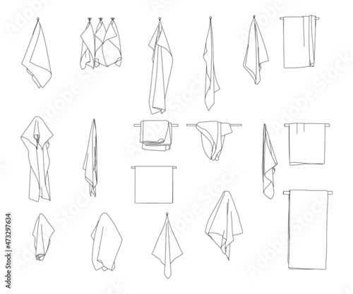 © German Ovchinnikov, Naklejka premium Set with contours of towels hanging on a hanger from black lines isolated on a white background. Front view. Vector illustration