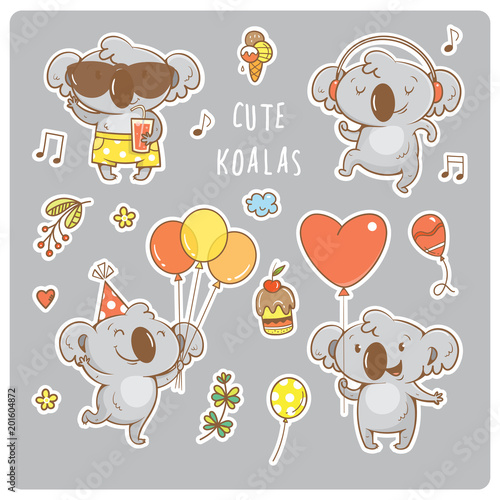 © voron4ihina, Fototapeta premium Set with cute cartoon koalas stickers. Vector contour image. Little funny baby animals on party. Children's illustration.