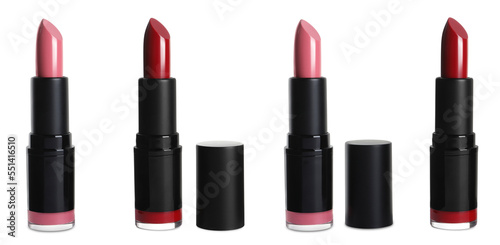 © New Africa, Obraz premium Set with different beautiful lipsticks on white background