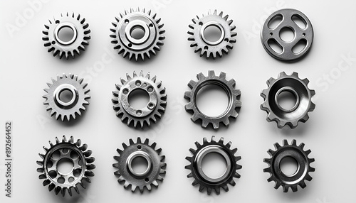 © Oleksiy, Obraz premium Set with different stainless steel gears on white background, top view