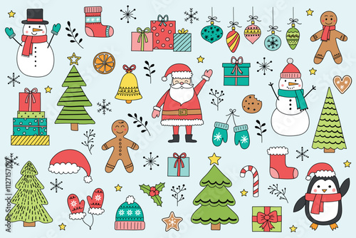 © One Pixel Studio, Fototapeta premium Set with hand drawn Christmas decorations. Collection with cute Santa Claus, snowman, cookie and tree. Vector illustration