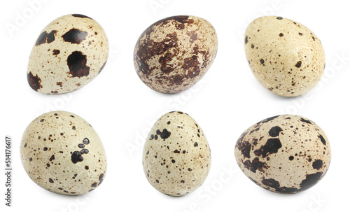 © New Africa, Fototapeta premium Set with quail eggs on white background