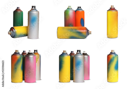 © New Africa, Naklejka premium Set with used cans of spray paints on white background