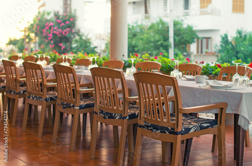 © M-Production, Obraz premium Setout table with tableware in modern restaurant.