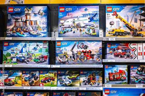 © monticellllo, Obraz premium Sets of Lego construction toys displayed on store shelves