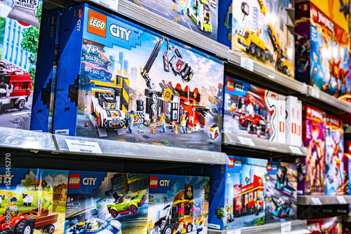 © monticellllo, Obraz premium Sets of Lego construction toys displayed on store shelves