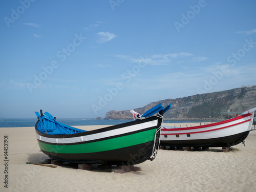 © Jessicadlcm, Naklejka premium sets of two antique fishing boats on the beach of Nazaré, Portugal. Restored painting. nice sunny day with the sea in the background.