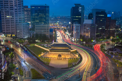 Obraz premium Seul. Obraz centrum Seulu z bramą Sungnyemun podczas godziny zmierzchu.