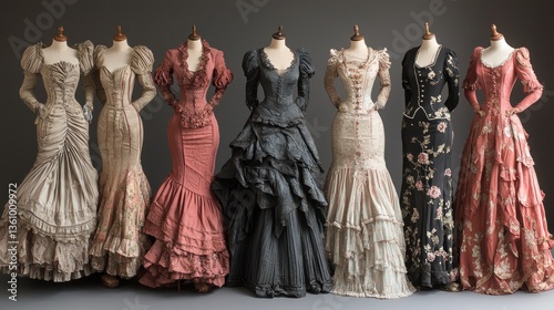 © harryaishi, Naklejka premium Seven antique-style gowns on mannequins.