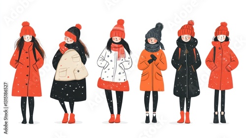 © Almahyra, Fototapeta premium Seven girls in winter clothes.