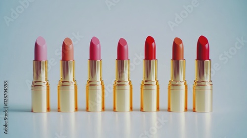 © Astri, Obraz premium Seven gold lipsticks in a row, showcasing a gradient of pink and red shades.