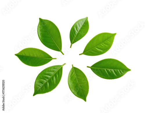 © Siomay, Fototapeta premium Seven green leaves arranged in a circular pattern against a stark, black background