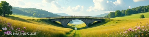 © somsak, Fototapeta premium Seven-hued bridge over tranquil pasture, wildflowers , orange, violet