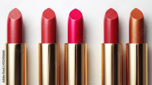 © The Little Hut, Obraz premium Seven lipsticks composition isolated on white background Pink red gold cosmetic makeup product sample : Generative AI