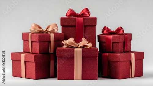 © Josiah, Obraz premium Seven red gift boxes stacked at eye level create a festive display for celebrations and special occasions across various settings