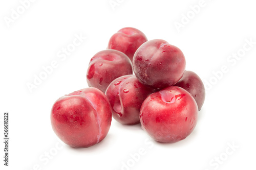 © Gregories, Obraz premium Seven red plums on white background, isolate
