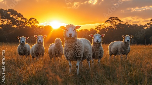 © Sang, Fototapeta premium Seven sheep graze in a golden meadow at sunset, a serene pastoral scene.