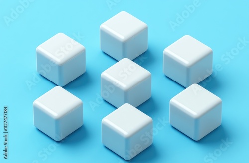 © reni, Obraz premium Seven white cubes arranged in a pattern on a light blue background.