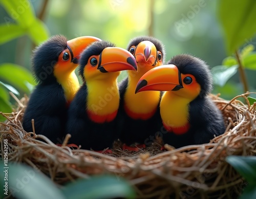 © Pete, Obraz premium Several baby toucans sit in nest. Young toucans with orange beaks and colorful feathers. These birds stay close together. Cute animal photo shows wildlife nature in tropical rainforest.