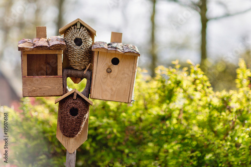 Fototapeta premium Several birdhouses and a bird feeder on a stick.